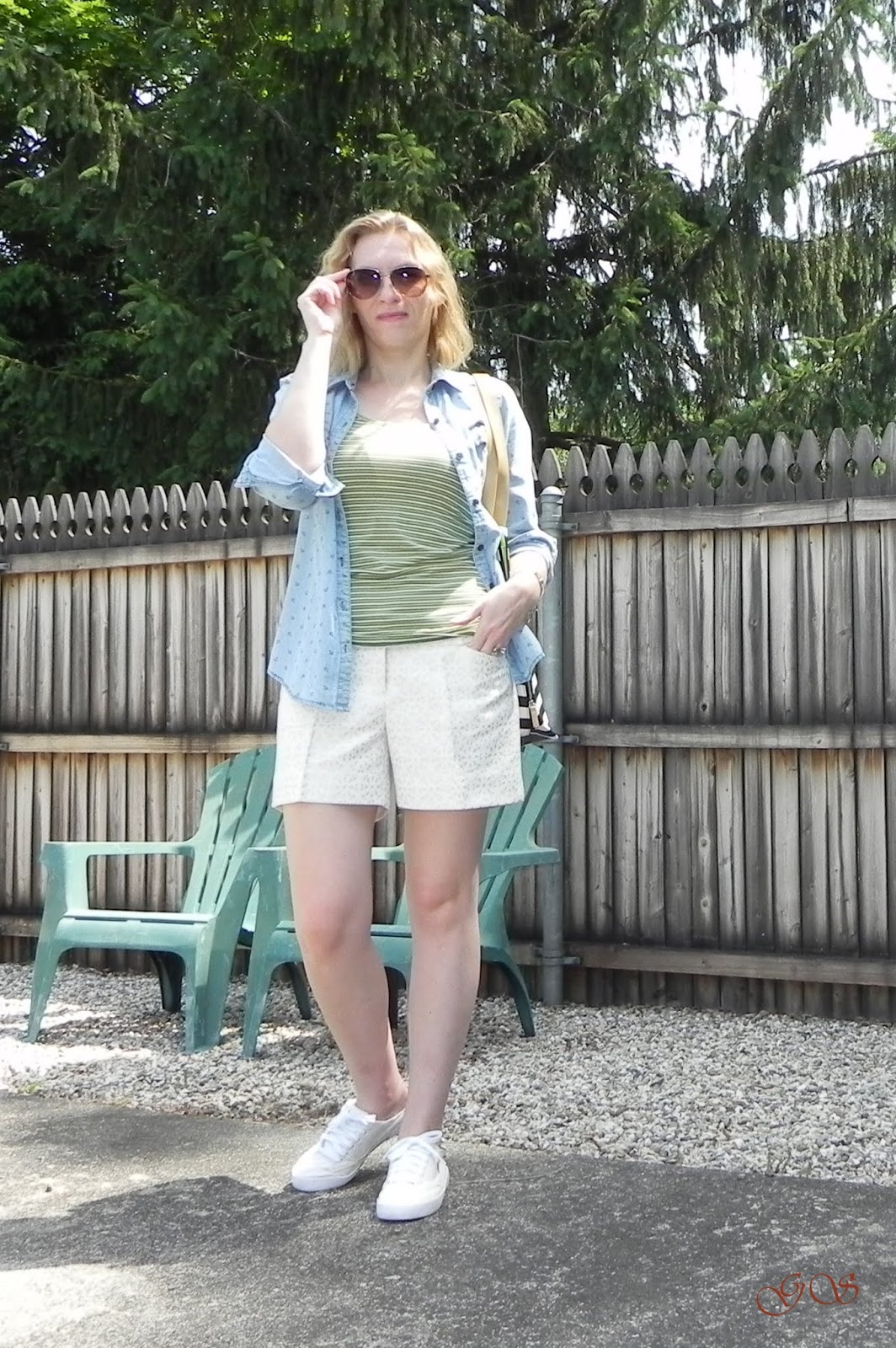 For day #2 'Style Me Pretty Summer Challenge' we are going with cute and comfy outfit.and must wear a denim shirt or vest + striped tee + white shorts + sneakers (if it's work wear: dressy chambray + striped tee + white pants + metallic or neutral flats).